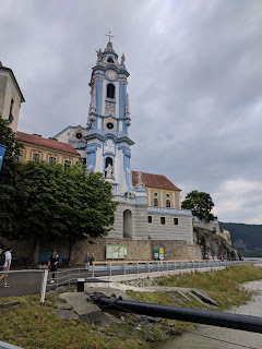 Then today we visited Melk Abbey and took a Danube River cruise! Melk was incredibly gorgeous, a Benedictine Abbey stationed on a rock overlooking the Danube in the Wachau region, famous for its wine. The Abbey was founded in 1089, but today's building was built in the early 1700s. It has living quarters, an impressive library, a private school for nearly 900 pupils, and a lovely church (in which we sang a quick song, of course). The ceiling frescoes in some rooms are painted on the normal curved ceiling, but others are painted to make the room's flat ceiling